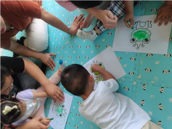 活動現(xiàn)場,老師讓小朋友們聽聲識物,先是小狗,再是小貓,當(dāng)聽到“呱呱”的聲音時,小朋友們答案不一,有的小朋友說是鴨子,有的說是青蛙。這時老師補(bǔ)充道:“這個聲音每天晚上池塘邊還可以聽到哦!”話音剛落,小朋友們統(tǒng)一答案是青蛙。“答對啦!”老師說道,隨后給每位小朋友發(fā)了一張青蛙圖片,需要小朋友們進(jìn)行涂色。涂色過程中老師一對一地指導(dǎo)小朋友們認(rèn)識顏色、學(xué)習(xí)握筆姿勢等等。最后大家一起參與“青蛙跳”小游戲,小朋友和家長們在歡聲笑語中結(jié)束了今天的課程。