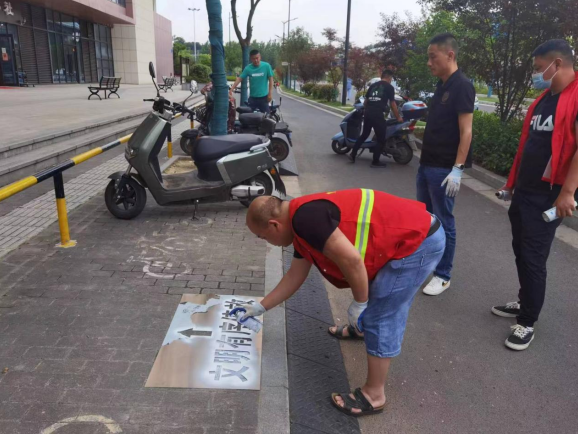 社區(qū)志愿者對石埠灣菜場周邊非機動車位上噴涂宣傳標語,志愿者手拿噴漆工具,彎腰將沿路停車位進行了噴涂。嶄新的標語格外顯眼,意在指引居民文明有序、規(guī)范停車,寄托著文明的內(nèi)涵和對居民的期盼。