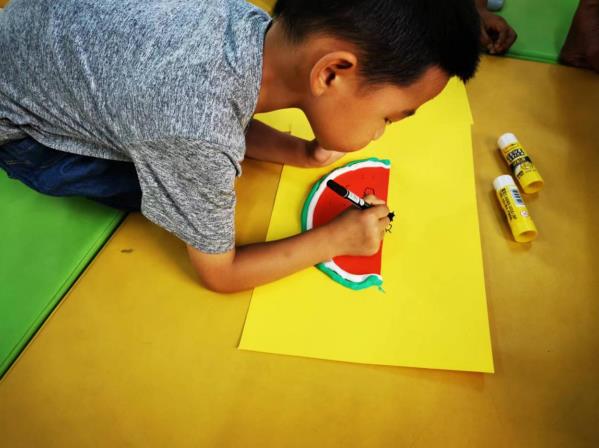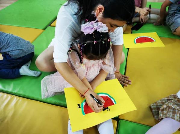 熱身環(huán)節(jié),為了緩解寶寶的緊張感,幼兒們跟隨著音樂不斷舞動(dòng)自己的身體,旨在讓寶寶在音樂中穩(wěn)定情緒,老師則讓家長(zhǎng)代替寶寶自我介紹,讓孩子初步感受友好地集體氛圍。閱讀《螞蟻和西瓜》環(huán)節(jié),幼兒們?cè)诩议L(zhǎng)和老師的指導(dǎo)下快樂地讀書,讓孩子們?cè)趫D文并茂的繪本閱讀中,養(yǎng)成良好的閱讀習(xí)慣。隨后,老師帶領(lǐng)幼兒畫創(chuàng)意畫《螞蟻和西瓜》,通過豐富多樣的繪畫材料,打破平面作畫的限制,提高幼兒的動(dòng)手操作能力,鍛煉幼兒手指靈活度。