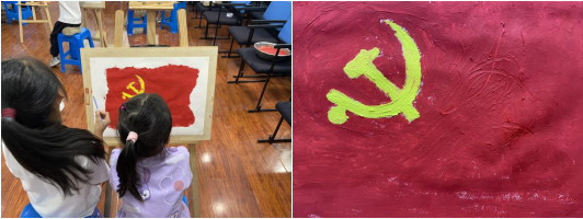 “誕生于南湖游船,猶如天際升起的朝陽。歷經(jīng)滄桑的祖國,如同沉睡的雄獅,在您耀眼的光芒下,猛然睜開了雙眼……”活動伊始,家長和孩子們共同朗誦了詩歌《黨在我心中》,回顧了黨百余年來的風雨征程,謳歌了黨百折不撓的偉大精神。接著,孩子們直抒胸臆,暢所欲言,他們表示課本里學習過的劉胡蘭、董存瑞的英雄事跡和不屈精神常常鼓舞著他們努力奮進,堅定信念。隨后,孩子們進行最后一項繪畫活動,他們通過手中的彩筆繪出向黨的心,結(jié)合“神舟十四號”而作的七彩火箭表達了對神秘太空的好奇,姐妹聯(lián)手繪制的黨旗則寓意著黨是我們的引路明燈。