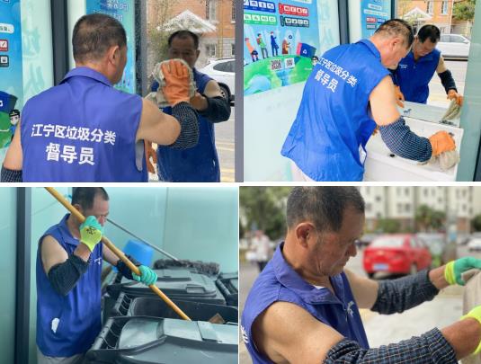 “我退休了,平時(shí)在家閑著,就來做垃圾分類指導(dǎo)員了,已經(jīng)做了近2年了。”何成喜這樣介紹道。每天早上5點(diǎn)多,他便到達(dá)了工作崗位,依次進(jìn)行清洗沖刷垃圾桶、廂房內(nèi)外消毒、廂房水池擦洗、地面清洗、在規(guī)定廂房口擺放垃圾桶等工作流程。“我每天來的早,先把衛(wèi)生打掃好,這樣居民們來投遞垃圾也更方便。”夏天時(shí)溫度高,垃圾容易滋生細(xì)菌產(chǎn)生異味,何成喜一邊和社工聊天一邊將廂房里里外外都進(jìn)行了消毒。