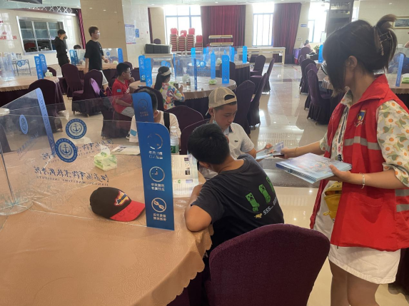 在海事學(xué)院,志愿者為孩子們發(fā)放宣傳手冊,介紹海事學(xué)院、普及航海知識、了解海上安全信息,孩子們認(rèn)真翻看知識手冊,聆聽志愿者的講解,在孩子們的心中種下一粒“走向深藍,科技向海”的種子。
