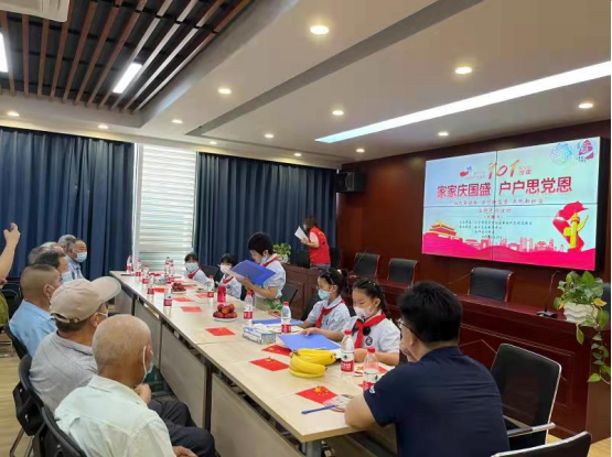 一張空白賀卡,畫上黨徽、黨旗、天安門、和平鴿等元素,佐以顏色,再寫下對(duì)黨的祝福,平面的、立體的、異形的……一張張獨(dú)一無二的精美創(chuàng)意賀卡便在少先隊(duì)員們的手中制作完成了。他們身穿校服、系紅領(lǐng)巾,將賀卡親手送給在場(chǎng)的每一位黨員,以少先隊(duì)隊(duì)禮敬之,向他們致以崇高的敬意。