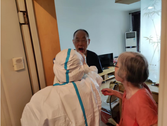 考慮到社區(qū)內有部分行動不便的老者以及殘疾人等特殊群體,為給此類人群提供方便,社區(qū)組織醫(yī)護人員攜帶工具上門采樣。老人對社區(qū)貼心周到的服務表示由衷感謝:“年紀大了,行動也不便,還好有社區(qū)一直體諒我們,謝謝了。”