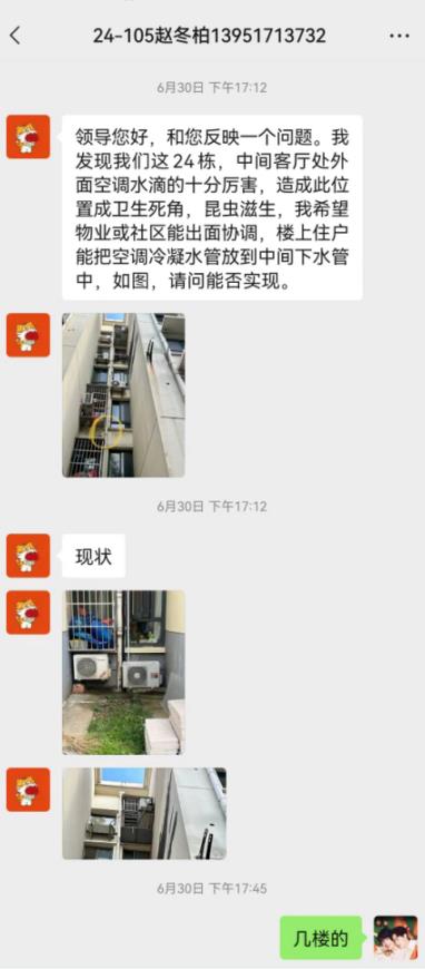 趙先生家住24棟105室,自入夏以來(lái)大家開始使用空調(diào),但是由于受空調(diào)的年限和安裝方式的影響,樓上的空調(diào)每天在傍晚至第二天的早晨開始不間斷的滴水,水滴落在樓下的空調(diào)外機(jī)上,滴滴答答,噪音非常擾人。趙先生通過(guò)“掌上云”社區(qū)向群主反應(yīng)了此事,群主第一時(shí)間回復(fù):會(huì)盡快溝通解決此事。社區(qū)協(xié)調(diào)物業(yè)人員上門查看并解決了此事。事后趙先生通過(guò)“掌上云”社區(qū)平臺(tái)發(fā)來(lái)了感謝信,社區(qū)做法獲得了群內(nèi)居民一致好評(píng)和贊揚(yáng)。