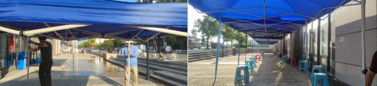 在氣溫30多攝氏度的艷陽天里,早上六點(diǎn),石埠橋村工作人員與志愿者加班加在點(diǎn)位搭涼棚,為提早開工做好準(zhǔn)備。上午7點(diǎn),在云霞居核酸檢測點(diǎn),不少市民已站立在涼棚下排長隊(duì)等待核酸采樣。8點(diǎn)不到,石埠橋兩個(gè)檢測點(diǎn)位醫(yī)護(hù)、社區(qū)工作人員、志愿者們更是頭頂烈日全副武裝地堅(jiān)守在崗,用汗水詮釋著責(zé)任與擔(dān)當(dāng)。