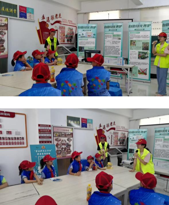 在社區(qū)活動中心,協(xié)會志愿者向隊員們介紹了水相關(guān)的基礎(chǔ)知識、“雙碳”目標以及自助綠化養(yǎng)護方法,隊員們認真聽講,并了解到一些力所能及的保護水資源的方法,在問答環(huán)節(jié)中躍躍欲試。
