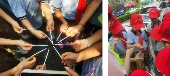 夏日炎炎,也擋不住隊員們親手檢測身邊河道水質(zhì)的熱情。在協(xié)會志愿者的指導(dǎo)下,現(xiàn)場進行明御河河水采樣,隊員們用手中的試紙檢測河水酸堿度,通過濾水實驗,深入了解水過濾的原理,當(dāng)?shù)弥獧z測河水水質(zhì)優(yōu)良時,歡呼雀躍,為南京城市環(huán)境治理成效感到驕傲,也感受到了繼續(xù)保持良好生態(tài)的責(zé)任和使命。