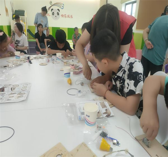 第二個環(huán)節(jié)是親子游戲互動、手搖發(fā)電機制作,社工老師首先通過提問、互動講解的方式分享中國四大發(fā)明相關知識,豐富孩子們的課外知識,進而引出本次活動的重點環(huán)節(jié)-----手搖發(fā)電機制作。孩子們在老師的一步步引導下搭建起小小的發(fā)電機,看到每個孩子好奇又認真的樣子,看得出孩子們非常開心。在完成后看著亮起的小燈泡個個笑的合不攏嘴,非常有成就感。一場簡單有趣的科學小實驗課程,不僅讓孩子們在實踐中體驗到了科學的神奇力量,同時也享受了科學帶來的樂趣。更在過程中體會到了成功的喜悅。