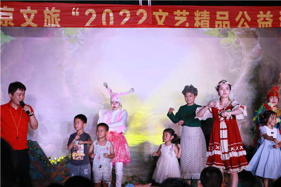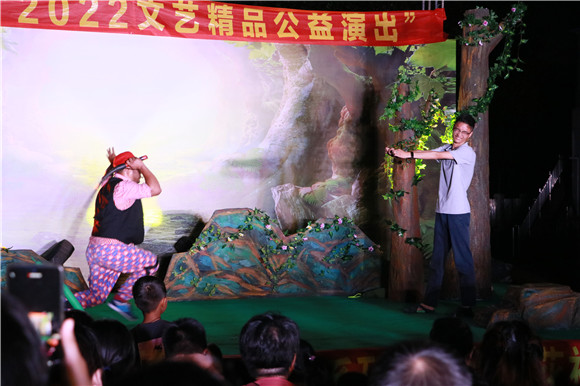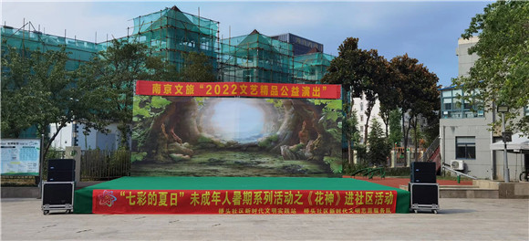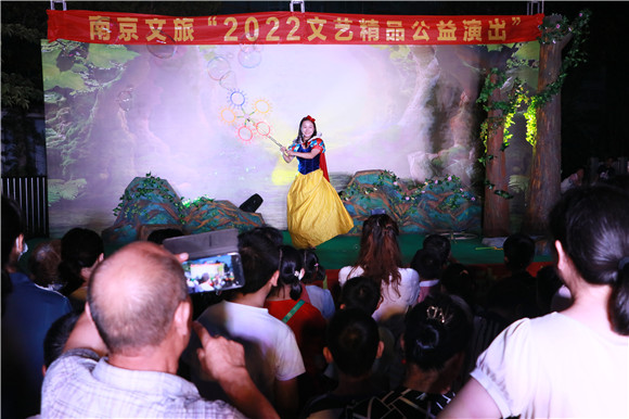 吹出五彩泡泡的白雪公主、揚(yáng)起牧馬鞭的小丑演員、智斗大灰狼的花仙子……7月23日晚,在江寧區(qū)淳化街道橋頭社區(qū)的小區(qū)廣場(chǎng)內(nèi),一場(chǎng)由南京文旅主辦的2022文藝精品公益演出在這里上演,為社區(qū)居民們獻(xiàn)上了精彩紛呈的藝術(shù)大餐。