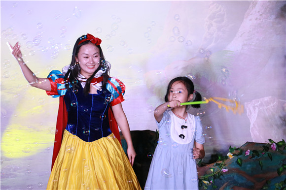 活動(dòng)剛開(kāi)始,身穿白雪公主裙子的演員亮相舞臺(tái)中央,瞬間點(diǎn)燃全場(chǎng),現(xiàn)場(chǎng)歡呼聲一片,不少小朋友主動(dòng)上臺(tái),與“白雪公主”夢(mèng)幻互動(dòng),在吹起的泡泡中感受童話(huà)般的世界。“哪位勇敢的爸爸自愿上臺(tái)配合牧馬鞭表演?”在小丑演員的鼓勵(lì)下,爸爸們鼓起勇氣上臺(tái),手拿一張報(bào)紙,配合著小丑演員揚(yáng)起的聲如鞭炮的牧馬鞭,臺(tái)下人員無(wú)不屏住呼吸,見(jiàn)證著令人緊張刺激的一幕。