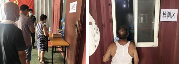 高溫天氣對于核酸檢測工作的開展帶來了更多的考驗,考慮到醫(yī)護人員們要穿著厚重的防護服,居民們也要在暑天中排長隊,極易出現(xiàn)中暑情況,社區(qū)將核酸檢測點設在了室內,社區(qū)袁書記還協(xié)調兩個集裝箱內裝設空調、電風扇,給醫(yī)護人員及排隊做核酸的居民送去一陣涼風。