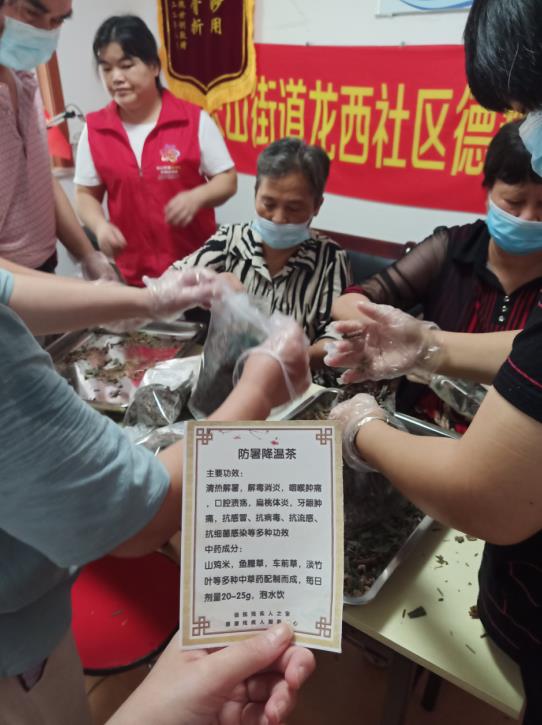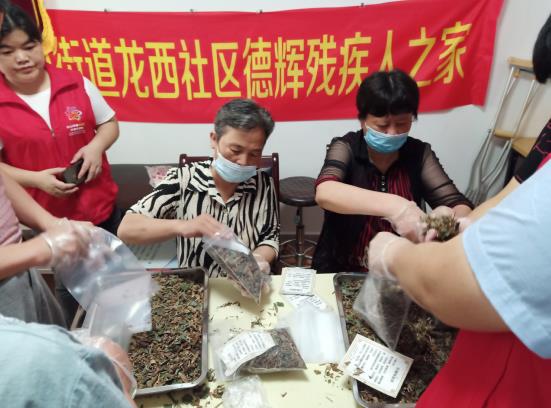 給社區(qū)居民科普了降溫茶的功效后,德輝殘疾人之家組織現(xiàn)場(chǎng)殘疾人現(xiàn)場(chǎng)制作防暑降溫茶,將已經(jīng)打磨好的中藥粉一一裝進(jìn)茶包中,制作好的防暑降溫茶包將送入東山街道的殘疾人人家。