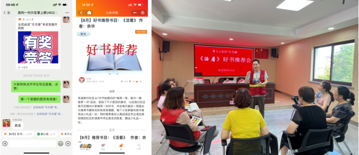 電瓷新村社區(qū)于“掌上云社區(qū)”開展好書推薦和全民閱讀“月月猜”欄目,開展“每周一薦,每月一猜,每季一評(píng)”活動(dòng),每月向大家推薦一本好書 ,并在每月最后一周提出一道與推薦書籍有關(guān)的題目,每個(gè)小區(qū)群最快答對(duì)者送小禮品一份;同時(shí)每季度在認(rèn)真閱讀且寫出讀后感投稿到社區(qū)的讀者中評(píng)出參名優(yōu)勝者,贈(zèng)送小禮品一份。