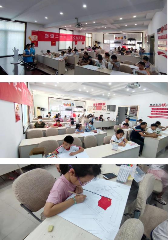 活動伊始,志愿者向小朋友們介紹了本次活動的流程和意義,小朋友們熱情高漲,躍躍欲試,在拿到志愿者分發(fā)的畫筆和畫紙后,立即投入到了緊張的繪畫創(chuàng)作中。用鉛筆打線稿、修改、涂色,小朋友們的畫紙上顯現(xiàn)出天安門、國旗、黨旗、火箭、宇航員,還有祖國的高樓大廈、大好山河……大家埋頭創(chuàng)作,用畫筆描繪出自己眼中的中國、中國的發(fā)展、中國的未來,表達(dá)了對黨的無限愛戴和對祖國的深厚感情。