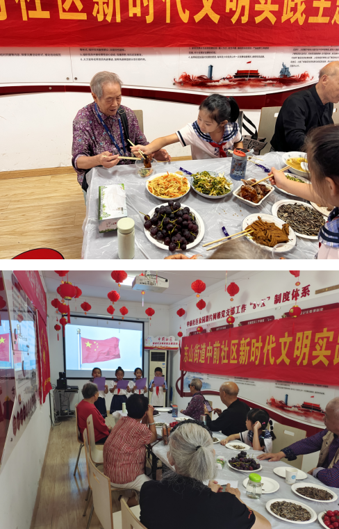 活動前夕,志愿者阿姨忙碌地為獨(dú)居老人們準(zhǔn)備了紅燒魚、水煮蝦、清炒西蘭花、青椒土豆絲、玉米排骨湯等種類豐富的菜品。活動現(xiàn)場,少先隊(duì)員帶來的表演如詩朗誦《青春禮贊》《會飛的鞋子》、歌曲《春天在哪里》《孤勇者》、相聲《哥倆好》、舞蹈《茉莉情懷》等引得在場的老人們紛紛鼓掌稱贊。老年代表演唱了戲曲和澎湖灣,最后在少先隊(duì)隊(duì)歌中整場活動落下了帷幕。老人們以及小朋友們圍坐在一起吃團(tuán)圓宴,談笑風(fēng)生,節(jié)日氛圍十分濃厚。