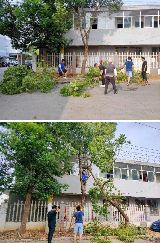 湖熟社區(qū)009號網(wǎng)格員錢文建接到周邊群眾反饋后第一時間到達現(xiàn)場,親自爬上大樹為居民排除險情。他在現(xiàn)場查看一番后當下決定自己動手修剪樹枝,熱心居民為其提供了家中的樓梯、刀鋸等工具,并一直在樹下與其他工作人員相互配合,確保樹枝安全修剪。