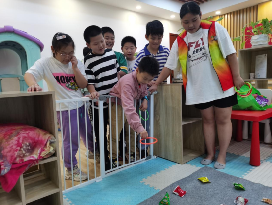 活動(dòng)開始前,社區(qū)工作人員向小朋友們宣傳《未成年人保護(hù)法》,呼吁小朋友們要遠(yuǎn)離校園暴力,對(duì)待同學(xué)和諧友愛?;顒?dòng)開始后,簡(jiǎn)單的套圈游戲拉開了本次活動(dòng)的序幕,社區(qū)工作人員組織小朋友們站在線外一個(gè)接一個(gè)的排好隊(duì),努力套中自己想要的獎(jiǎng)品。