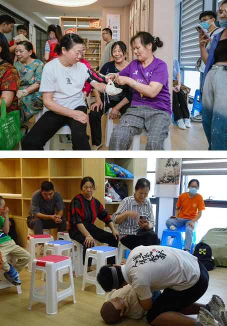 社區(qū)還邀請(qǐng)了部分居民參與應(yīng)急救護(hù)培訓(xùn),就遇到氣道異物梗阻等突發(fā)情況時(shí)如何及時(shí)進(jìn)行急救處理等進(jìn)行了詳細(xì)的講解,并提供了現(xiàn)場(chǎng)示范。在志愿者的指導(dǎo)下,居民們將學(xué)到的理論知識(shí)應(yīng)用于“實(shí)踐”中,體驗(yàn)如何包扎、如何正確使用海姆立克急救法、心肺復(fù)蘇以及AED等急救方法。