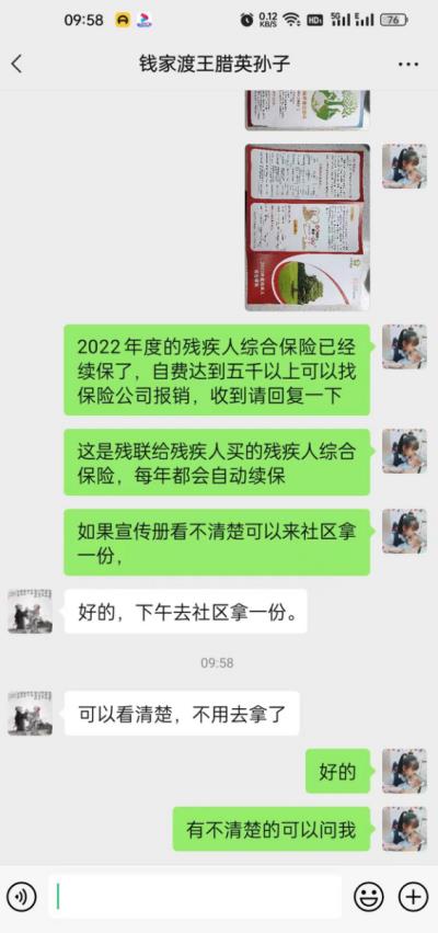 和平村網(wǎng)格員通過線下見面以及線上微信交流的方式,對殘疾人綜合保險政策進行宣傳講解。從保險保障責任、保障范圍、賠償標準、理賠程序、報案途徑及殘疾人綠色理賠通道等方面進行了介紹。為確保宣傳取得實效,網(wǎng)格員還發(fā)放了《殘疾人意外傷害保險宣傳手冊》,并在介紹政策的過程中及時解答殘疾人的疑惑。