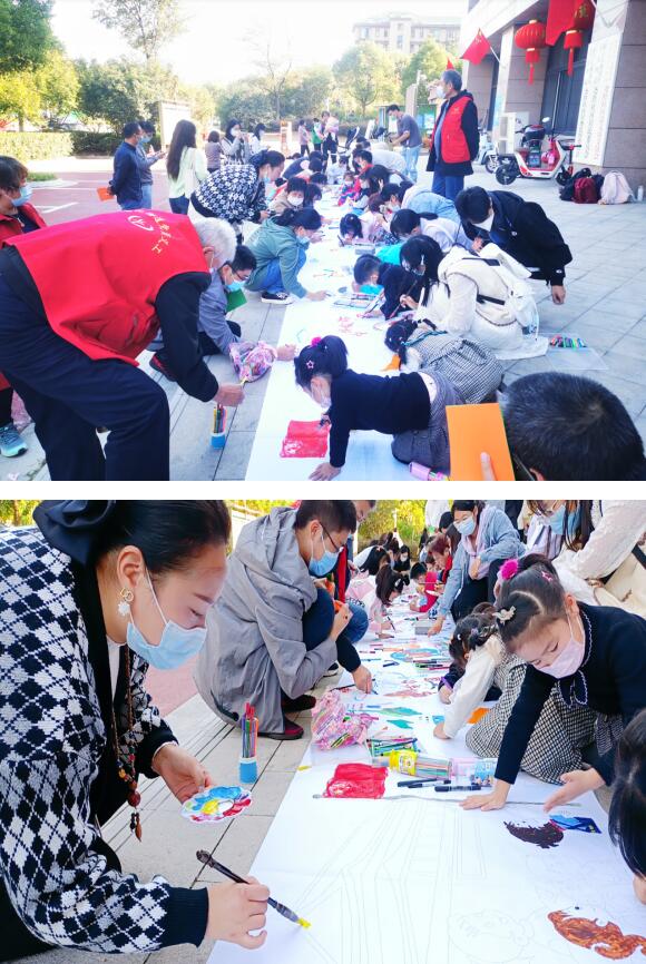 緊接著,社區(qū)青少年及家庭成員攜手老黨員共同繪制了百米長卷《我和我的祖國》。在家長和老黨員的指導(dǎo)下,社區(qū)青少年滿懷激情地描繪著自己心中對祖國的熱愛,創(chuàng)造出了一幅幅色彩斑斕、靈動活潑的畫卷,為美麗中國獻(xiàn)上真摯的祝福。最后,社區(qū)青少年及家庭攜手老黨員與《我和我的祖國》百米畫卷進(jìn)行合影留念。