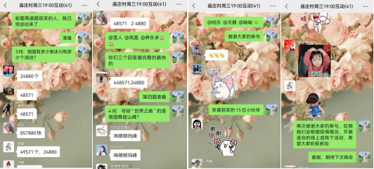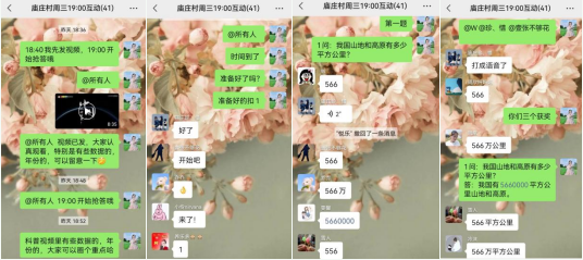 活動伊始,廟莊村工作人員與活動人員共同觀看《中國,從哪里來?》科普視頻,“大家認(rèn)真觀看,特別是有些數(shù)據(jù)的、年份的,可以著重留意一下哦!”在工作人員的提示下,大家全神貫注,緊盯屏幕。互動問答環(huán)節(jié),大家積極搶答工作人員提出的問題,每一輪前三名答對問題的村民都能獲得小禮品,活動群內(nèi)熱鬧非凡。
