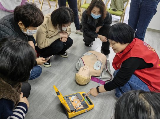 “出門在外,我們可能會遇到一些緊急情況,比如有人走在路上突然心臟驟停暈倒,你該怎么辦?”活動中,南京市紅十字會救護培訓中心主任導師,江寧區(qū)紅十字會救護培訓師張老師結(jié)合自身豐富的急救知識和實踐經(jīng)驗,以形象生動的語言、鮮活的事例,圖文并茂地講解了應急救護第一反應機制、心肺復蘇、海姆立克急救法、創(chuàng)傷救護、心臟自動除顫儀(AED)使用等常見急救知識。此外,張老師還帶領大家進行心肺復蘇、創(chuàng)傷止血包扎等實操演練,讓媽媽們更直觀地掌握具體注意事項和操作技巧。