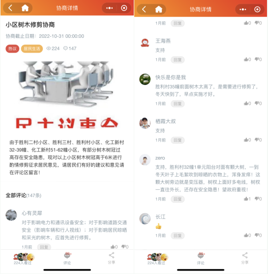 “勝利村前面的樹(shù)木太高了,是需要進(jìn)行修剪了,冬天快到了,早點(diǎn)實(shí)施才好。”由于小區(qū)內(nèi)部分樹(shù)木長(zhǎng)得過(guò)高,不僅影響居民采光,還存在著安全隱患。考慮居民生活實(shí)際,近日,南京市棲霞區(qū)燕子磯街道電瓷社區(qū)通過(guò)“掌上云社區(qū)”開(kāi)展線上民主議事會(huì),就修剪樹(shù)木一事向居民廣泛征集意見(jiàn)和建議。