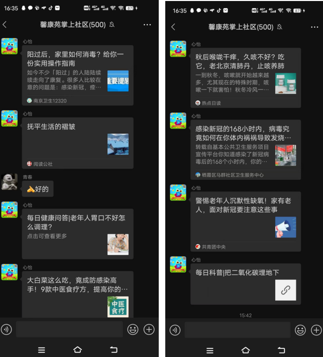 “陽了,最近居家隔離,通過社區(qū)群學(xué)習(xí)了不少防疫知識,應(yīng)對病毒也更有心得了”、“疫情當下,我們在做好個人防護的同時,也要注重自身的營養(yǎng)狀況”、“近期許多人都陷入了“幻陽”恐慌,原來,比陽性更可怕的,是我們的‘疫情心態(tài)’”、“疫情之下,各種訊息撲面而來,魚龍混雜,讓人難以分辨。感謝工作人員的暖心推送,選藥用要藥科學(xué)多了”.....此系列宣傳工作受到了居民的紛紛點贊,大家一致表示“實用!受益!”