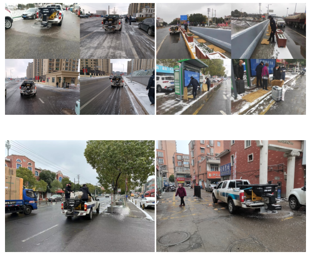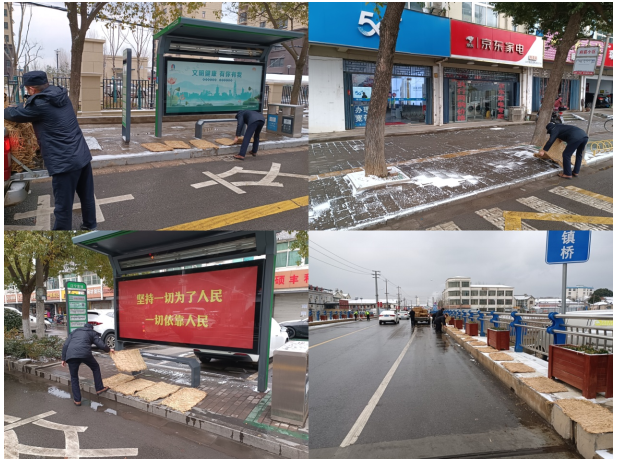 根據市區(qū)指揮部工作要求以及實時雪情變化,組織中隊強化夜間巡查值守,對集鎮(zhèn)主干道路、橋梁路面等處不間斷散播融雪劑,以防路面積雪結冰。同時進一步加大集鎮(zhèn)區(qū)域車巡步查頻次,在公交站臺、橋梁人形道上鋪設草墊防滑,引導沿街商戶落實門前三包、清掃門前積雪,多舉措保通暢。