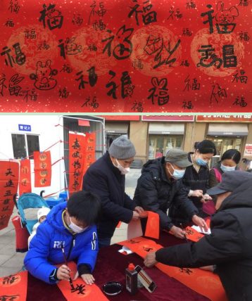 天增歲月人增壽,春滿乾坤福滿樓;虎嘯山林傳喜訊,兔迎祥瑞唱春風(fēng);金虎歸山辭舊去,玉兔下凡迎春來……書法家們根據(jù)居民的要求,現(xiàn)場創(chuàng)作。他們不畏嚴(yán)寒,飽含熱情,一起一落間,一副副蒼勁有力、喜慶洋溢、滿載美好祝愿的春聯(lián)躍然紙上。活動最后,大家齊寫福字迎新春,祈盼來年風(fēng)調(diào)雨順、萬福降臨。