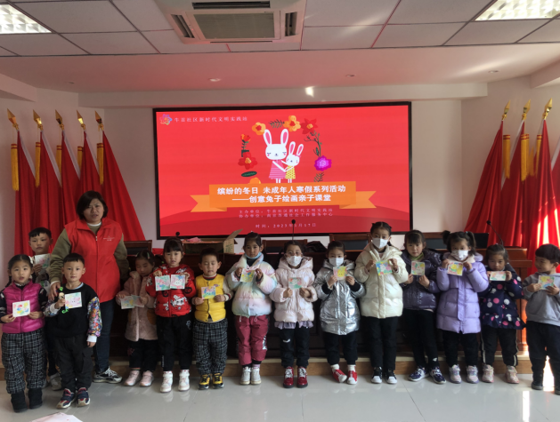 為了豐富社區(qū)孩子們的業(yè)余生活,鍛煉他們的動(dòng)手能力,加強(qiáng)親子溝通,增強(qiáng)親子之間的情感互動(dòng)交流,在新春佳節(jié)來(lái)臨之際營(yíng)造喜慶、祥和的氣氛,1月17日,江寧區(qū)秣陵街道牛首社區(qū)開(kāi)展“繽紛的冬日”未成年人寒假活動(dòng)——創(chuàng)意兔子親子繪畫(huà)。