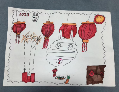 “春節(jié)是咱們國家的傳統(tǒng)節(jié)日,代表著團圓和幸福。過春節(jié)時你們印象最深的一件事兒是什么呀?除了穿上漂亮的新衣服、收到心儀的玩具,有沒有通過網絡詳細了解春節(jié)的傳統(tǒng)風俗,或者許下了美好的新春愿望呢?”大家充分發(fā)揮想象力和創(chuàng)造力,有的畫舞獅,有的畫燈籠,有的畫牛年吉祥物......經過孩子家長的指導創(chuàng)作,一幅幅風格各異的作品展示在大家面前,孩子們開心地與自己的作品合影,在寒假即將結束之際,留下難忘的瞬間。