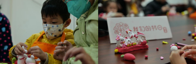 最令孩子們期待的莫過于制作兔子面塑了,活動開始前,社工老師首先向孩子們介紹了面塑的歷史淵源與發(fā)展,并向孩子們展示各式各樣面塑的藝術(shù)圖片,伴隨著陣陣“哇”的驚嘆聲,孩子們躍躍欲試。隨后老師現(xiàn)場進(jìn)行面塑教學(xué),配合著實(shí)際操作,對制作面塑時(shí)不同的手法,如捏、搓、揉、刻、劃等詳細(xì)進(jìn)行介紹,并將提前準(zhǔn)備好的制作材料分發(fā)給參與活動的每個小朋友。通過通過揉、搓、捏、切、刻、劃不同手法,每個孩子都塑造出了屬于自己的“小兔子”。孩子們的成就感也立馬拉滿。