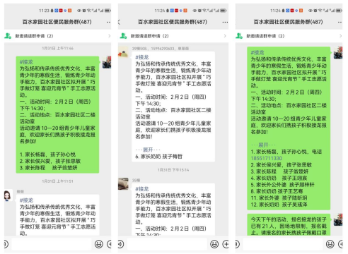 線上宣傳能使社區(qū)服務方便、快捷,也讓信息的覆蓋面更加廣泛。1月31日,社區(qū)通過“掌上云”平臺將元宵節(jié)制作花燈活動的通知發(fā)布到居民群、網(wǎng)格群內(nèi),邀請居民在群內(nèi)積極接龍報名參加活動,截至2月2日,共有21組家庭報名。