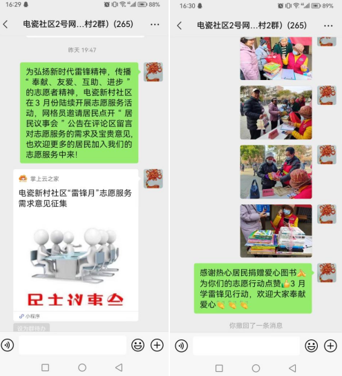 社區(qū)網(wǎng)格員微信群宣傳,征集志愿服務需求,居民有需要志愿來幫忙,同時歡迎更多的志愿者加入到志愿服務中來。