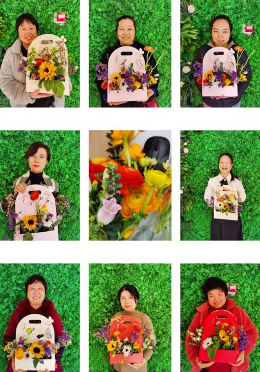 一束束色彩斑斕的鮮花做好了,每個人用靈巧的雙手將鮮花配以枝葉點綴,精工裁剪,根據(jù)不同的色彩整合,形成了一幅幅獨具匠心的插花作品,造型各異,典雅別致。