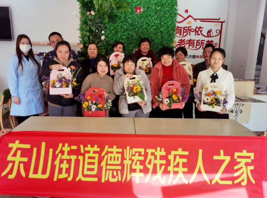 春天來了,美好的事都將如期而至,花香四溢,在這個暖意融融的春日,第113個“三八”國際婦女節(jié)即將來臨,為豐富南京市江寧區(qū)東山街道龍西社區(qū)殘疾人的精神生活,陶冶情操,展現(xiàn)亮麗風(fēng)采,3月6日下午,德輝殘疾人之家主辦——三八婦女節(jié)藝術(shù)插花主題活動,共計20余名殘疾人參加。德輝特邀花藝技師瀟瀟老師為現(xiàn)場殘疾人教授插花技巧,為生活增添一抹“靚色”。