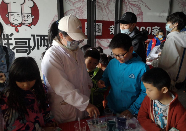 “紫甘藍(lán)也能變彩虹”如名所示,用到了酸堿指示劑變色的相關(guān)原理。家常菜中的紫甘藍(lán)遇白醋和小蘇打后呈現(xiàn)不同的顏色,絕妙的展現(xiàn)了化學(xué)與生活的精彩碰撞,為小朋友帶來(lái)不一樣的體驗(yàn)。講師剛開(kāi)始向小朋友一一展示了桌子上的化學(xué)試劑,說(shuō)明了什么顏色。紫甘藍(lán)原本是紫色,小朋友在講師的指導(dǎo)下,向紫甘藍(lán)中分別滴加白醋和小蘇打,發(fā)現(xiàn)兩種溶液的顏色并不相同。小朋友問(wèn):“這是為什么呀?”講師向小朋友解釋了其中的原理,小朋友很認(rèn)真地點(diǎn)了點(diǎn)頭。