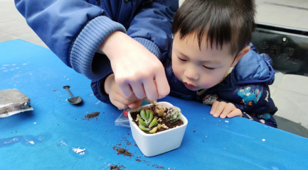 先將泥土倒進(jìn)花盆中,將多肉栽至合理的位置,鋪上一層碎石子,最后插上各式各樣的裝飾品……小朋友們一步步設(shè)計(jì)栽植了屬于自己的多肉小盆栽,并在與家長(zhǎng)們的溝通中不斷完善著自己的作品。小小的一盆多肉,凝聚的是家長(zhǎng)們的關(guān)愛與孩子們滿滿的創(chuàng)意。多肉盆栽制作完畢后,小朋友們紛紛抱著作品與家長(zhǎng)開心地拍照留念。
