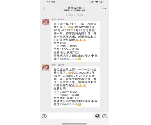 物業(yè)費(fèi)是維護(hù)小區(qū)公共設(shè)備設(shè)施、維持正常秩序所必須的費(fèi)用,及時(shí)交納物業(yè)費(fèi)是每位業(yè)主應(yīng)盡的義務(wù),工作人員在掌上云群中每天推送消息,提醒居民按時(shí)繳納物業(yè)費(fèi),減少了以往在小區(qū)內(nèi)挨家挨戶宣傳的工作量,提高了物業(yè)費(fèi)的收繳率,達(dá)到了事半功倍的效果。