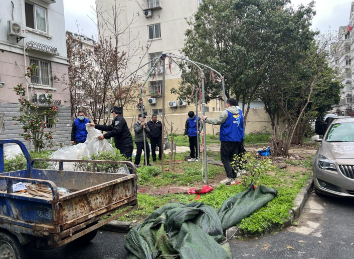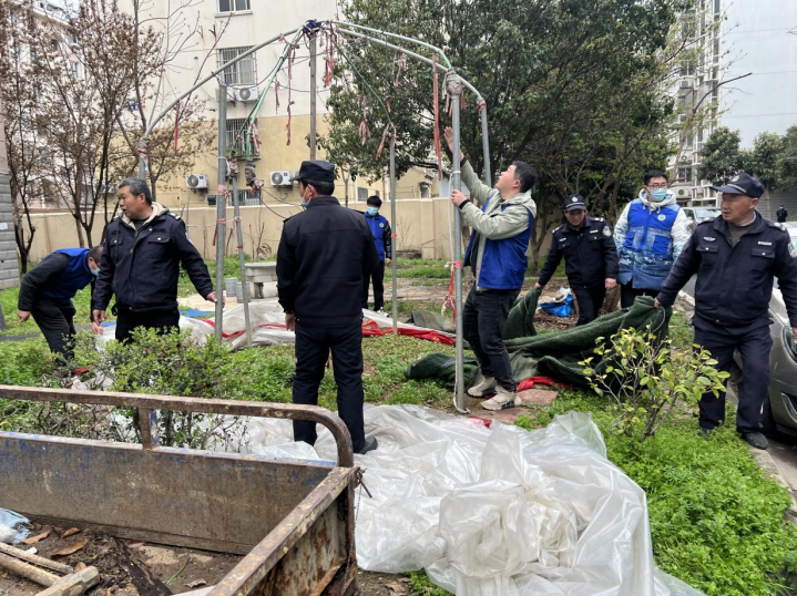 近日,南京市江寧區(qū)淳化街道橋頭社區(qū)網(wǎng)格員在巡查時發(fā)現(xiàn)在潭橋北園有人私搭違建休閑帳篷,且堆積了不少雜物。違建休閑帳篷不僅影響整體環(huán)境,還會造成雨水沖蝕泥濘等環(huán)保安全問題。為了消除隱患,橋頭社區(qū)網(wǎng)格員、城管、物業(yè)及公安在潭橋北園對這處違規(guī)建筑進(jìn)行了執(zhí)法拆除,并清除了周圍堆放的雜物。