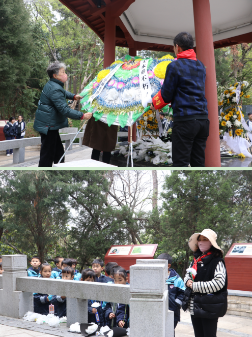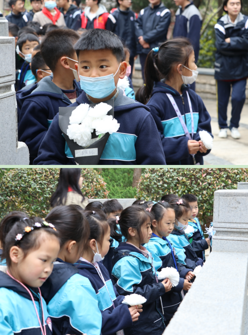 活動現(xiàn)場,莊嚴(yán)肅穆,全體成員在烈士墓碑面前向烈士默哀,實小副校長陳勇、德育處厲登高進(jìn)行總結(jié)。隨后,在相關(guān)工作人員的帶領(lǐng)下,學(xué)生們向烈士敬獻(xiàn)花圈,整理挽聯(lián),向烈士三鞠躬,并繞陵墓一周,敬獻(xiàn)小白花。每個人都滿懷著對烈士的敬意和哀思,也表達(dá)著對烈士們“拋頭顱、灑熱血”愛國精神的崇高敬仰。