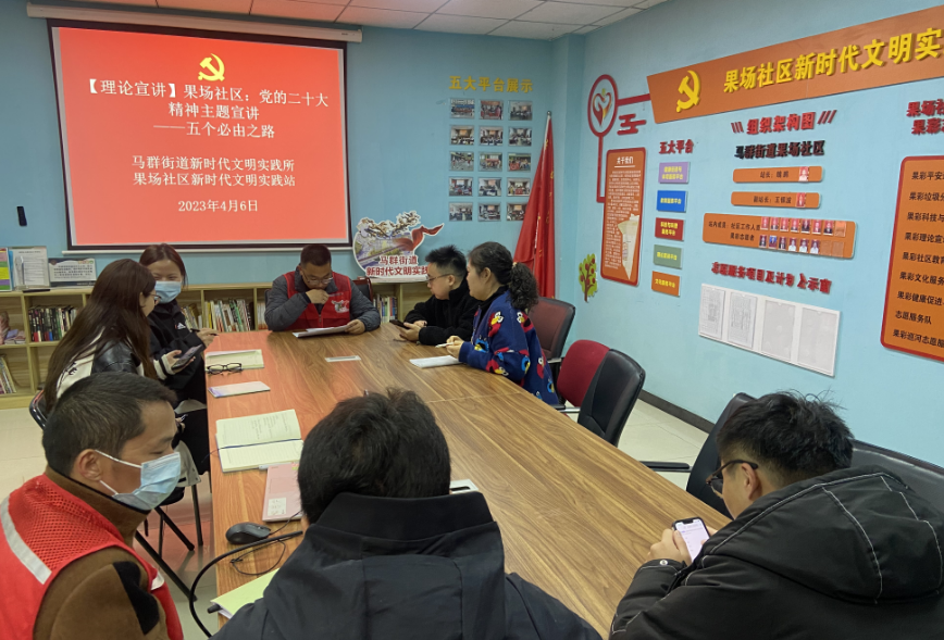 2023年4月6日下午,馬群街道新時代文明實踐所與果場社區(qū)新時代文明實踐站進行站所聯(lián)動,依托理論宣講服務(wù)平臺,在社區(qū)一樓實踐站文化陣地,組織社區(qū)黨員、新業(yè)態(tài)新就業(yè)群體黨員、民兵、退伍軍人、“齊益果”積分制志愿者開展黨的二十大精神宣講。本次宣講人由社區(qū)黨員陶博擔當志愿者,宣講內(nèi)容主要為“五個必由之路”。