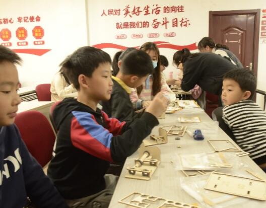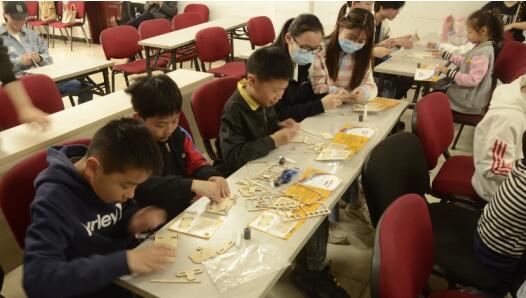 介紹完磁懸浮列車,主講同學(xué)由表及里,詳細(xì)講解了磁鐵的性質(zhì)。為了讓小朋友更好地感受磁鐵的特性,主講同學(xué)設(shè)計了兩個簡易的實驗。第一個實驗是制作能讓物體懸浮的小車,在志愿者的幫助下,小朋友們認(rèn)真安裝好木片,接著,按照同極相斥的原理安插好小磁環(huán),最后再用膠水固定,一個神奇的磁懸浮裝置便制作完成。