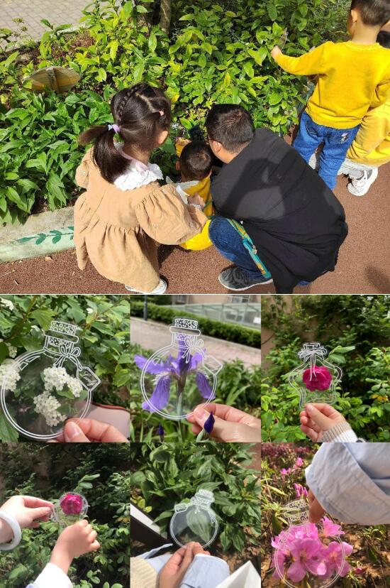 本次“定格春天”活動分為三個階段:尋春——捕捉春天的氣息,留春——制作壓花杯墊和書簽,惜春——合影留念。小朋友與大自然親密接觸,在各個園區(qū)拍攝當下的春景,月季、鳶尾、繡線菊、杜鵑、玫瑰等被小朋友欣喜的“裝”進瓶子里。