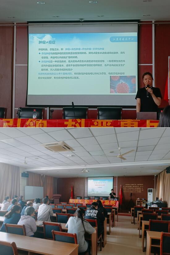 本次宣講特邀請江蘇省腫瘤醫(yī)院放療科護士長鄒美英及副主任醫(yī)師劉雅恬給居民開展知識講座,講座圍繞腫瘤流行病學概況、癌癥的一級預防、癌癥的二級預防等內(nèi)容,深入淺出地向居民們講解了癌癥的種類、發(fā)病的相關因素、表現(xiàn)、如何預防等,倡導居民養(yǎng)成良好的飲食習慣,通過健康的生活方式防癌抗癌,做到早預防、早發(fā)現(xiàn)、早診斷、早治療。