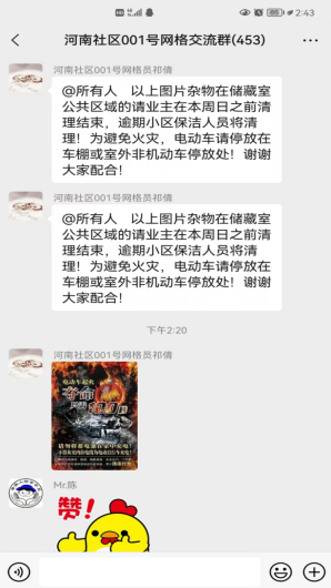 同時(shí),對(duì)樓道內(nèi)停放車輛、電瓶車亂停亂放及充電現(xiàn)象進(jìn)行檢查。對(duì)占用樓道的車輛,網(wǎng)格員在網(wǎng)格群內(nèi)通知,并將其移到室外電動(dòng)車停放點(diǎn)。針對(duì)私拉電線違規(guī)對(duì)電動(dòng)車充電的情況,發(fā)現(xiàn)問(wèn)題后及時(shí)勸導(dǎo)收回線路,提醒居民把車輛搬到安全地段,并在網(wǎng)格群內(nèi)向居民做好安全隱患問(wèn)題的宣傳工作。