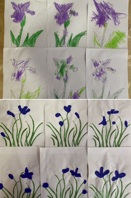 五月,鳶尾花開(kāi)得正盛,陽(yáng)光照耀下顯得格外鮮艷,猶如一只只翩翩起舞的蝴蝶。微風(fēng)拂過(guò),紫色“波浪”輕輕搖曳,美不勝收。孩子們仔細(xì)地觀察花瓣的顏色,還有葉子的形狀,并選擇自己喜愛(ài)的方式記錄植物,有的為鳶尾花的線描圖添上顏色,有的用超輕黏土在有葉子的圖中添上鳶尾花,在志愿者老師的帶領(lǐng)下,大家一同體會(huì)生命成長(zhǎng)的可貴。最后,大家開(kāi)心地展示作品,分享喜悅。