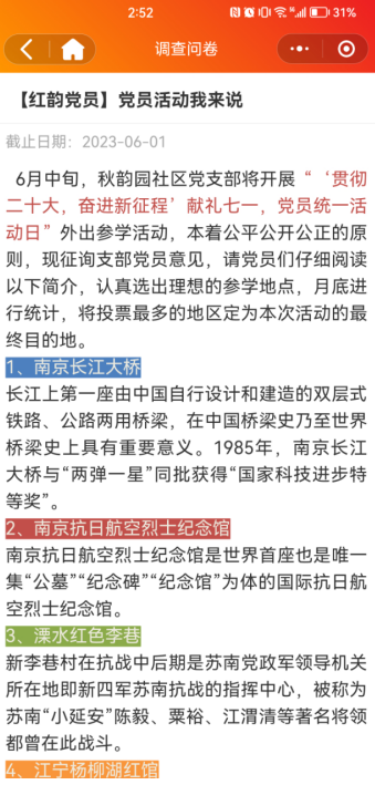 六月中旬,南京市棲霞區(qū)邁皋橋街道秋韻園社區(qū)黨支部即將開展“貫徹二十大,奮進(jìn)新征程”獻(xiàn)禮七一·黨員外出參學(xué)活動(dòng),為了能快速精準(zhǔn)地征詢黨員意見,秋韻園社區(qū)黨支部利用掌上云小程序“調(diào)查問卷”模塊發(fā)起了黨員活動(dòng)我來(lái)說(shuō)投票,讓黨員足不出戶即可選擇出理想的參學(xué)地點(diǎn)。